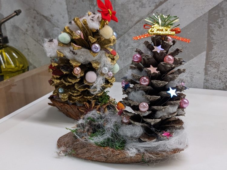 また、恒例の松ぼっくりツリーづくりは今回は特別に大きなクリスマスオーナメントもご用意しました。
