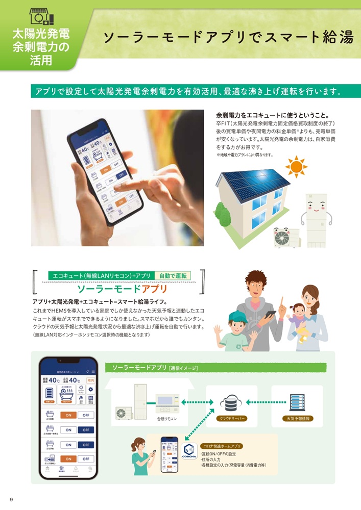 今回のエコキュートは、コロナの製品で、無線LAN対応インターホンリモコンを付ける事でアプリと連携してスマホで外出先からも、ふろ自動やタンク湯増しなど、様々な操作が出来る事に加えて天気予報データから自動でエコキュートの運転を計画してくれます。太陽光発電余剰電力がある場合は自動で昼間に沸き上げ、電力消費を抑える機能も付いているので電力消費を抑えてくれます♬